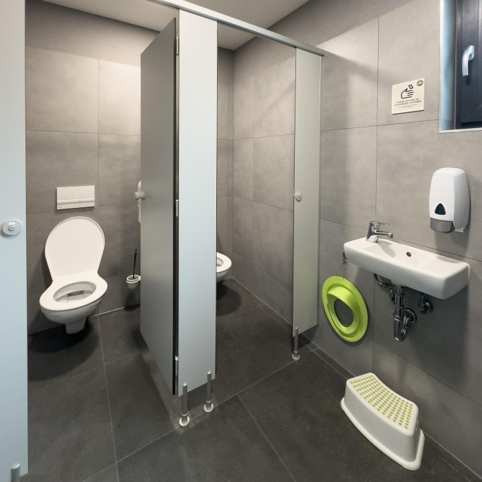 V sociálnom zariadení sa nachádzajú aj pánske a dámske toalety, sprchy a rodinná sprcha.